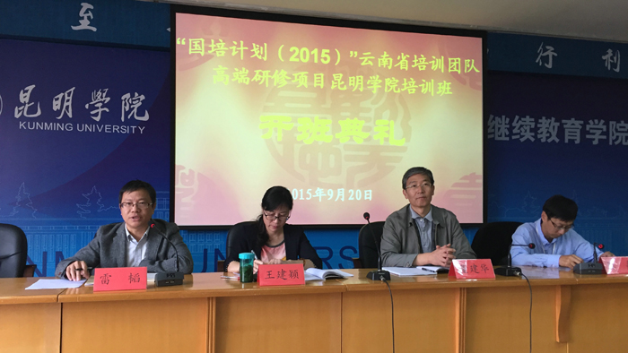 9月20日上午,“国培计划(2015)”云南省培训团队高端研修项目beat365官方网站培训班开班典礼在昆师路校区继续教育学院隆重举行。云南省教育厅副厅长王建颖,beat365官方网站副校长董建华,云南省教育厅师范教育处处长雷韬等领导出席,近200名学员参加了开班。典礼由继续教育学院院长陈嘉主持。