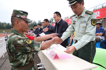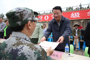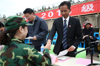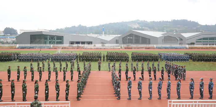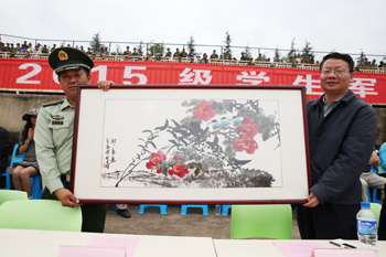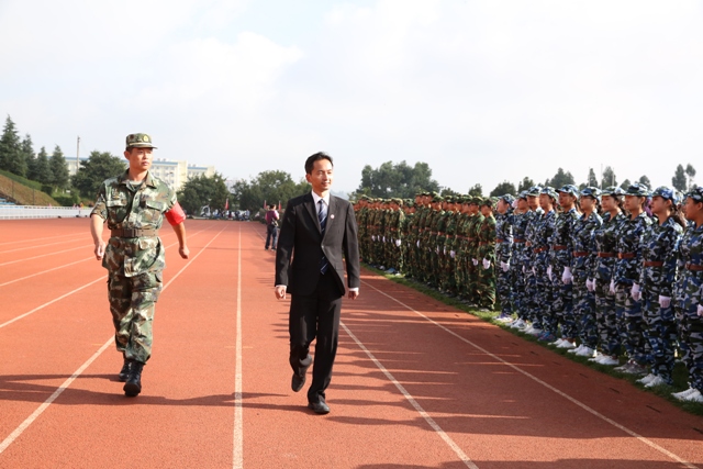 9月11日上午,beat365官方网站2015级学生军训汇报表演暨总结表彰大会在学校田径运动场隆重举行。学校党委书记陈世波出席大会并代表学校向承训部队云南武警边防部队士官学校赠送纪念匾额,校长何华检阅军训学生方队。武警边防部队士官学校训练部副部长(大校警衔)赵立志、武警边防部队士官学校装备维修系政委汪发云,学校党委副书记孙勇,党委副书记、纪委书记李媛芬,副校长李翔、熊晶、郭华、董建华出席大会,并同其他与会领导一同为获奖集体和个人颁奖。郭华主持大会。