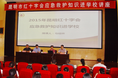 6月16日下午,由昆明市红十字会主办,保卫处协办的应急救护知识讲座在beat365惟行楼1501报告厅举行。讲座邀请到中国研究型医院学会心肺复苏学会委员、北京市红十字会应急救护工作指导委员会专家委员马桂林主讲。昆明市红十字会副会长冯浩、备灾中心主任岳巍、组织宣传部部长漆一桦与beat365校团委社团、医学院、教师教育学院学生代表以及保卫处干部、保安200余人一起聆听了讲座。讲座由保卫处处长方永昆主持。