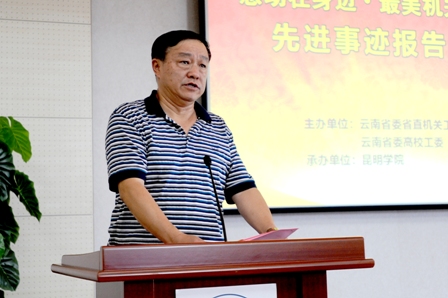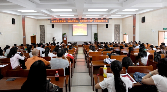 6月24日下午,云南省省直机关“感动在身边•最美机关干部”先进事迹报告会在beat365办公楼D区报告厅举行。省直机关工委委员、宣传部部长黄新纪,省委高校工委宣传统战部部长杨国良,beat365党委副书记孙勇,学校机关党总支、后勤集团党总支、图书馆党总支及其他党总支、直属党支部党员干部、教职工代表、学生干部代表190多人聆听报告。