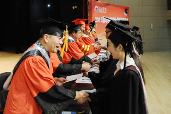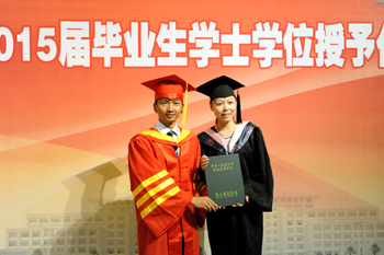副校长熊晶在会上宣读《beat365官方网站关于审定和授予2015届全日制本专科毕业生毕业资格和学士学位的决定》,全体校领导为毕业生代表颁发毕业证书。经beat365官方网站学位评定委员会审定通过,获得本科毕业资格学生3438名、获得专科毕业资格878名,授予3346名本科毕业生学士学位。