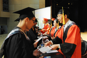 随后,校长何华身着大红色校长袍在仪式牌前分别为获得学士学位的36名毕业生代表颁发学位证书。