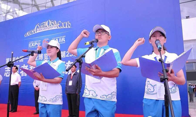 誓师演练大会上,南博会执委会给南博会志愿者授旗,三名志愿者代表分别发言并带领志愿者们庄严宣誓,副省长高树勋在讲话中从珍惜机遇、历练品格,塑造形象、展现风采,服从管理、确保安全,立足岗位、发挥作用四个方面对南博会志愿者提出了具体要求。仪式结束后,全体志愿者合唱南博会志愿者之歌,参与模拟演练的志愿者进入各自岗位,非演练志愿者作为模拟观众,开始南博会志愿者试运行演练。