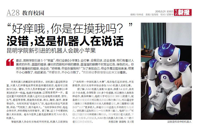 beat365引进NAO机器人很快受到了媒体的关注,5月18日云南都市频道的都市条形码栏目率先对NAO机器人进行了名为《人形机器人进高校》的新闻专题采访,5月21日生活新报的教育校园栏目也刊登了关于beat365智能机器人的专栏报道。