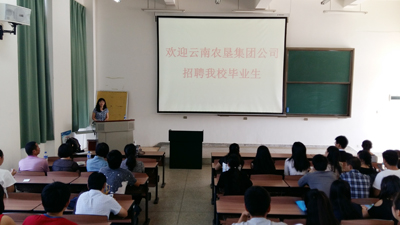 招生就业处处长包兴偕同集团公司人事部秦燕部长及下属8家企业人员来到博雅楼2103多媒体教室, 包兴首先向同学们简单介绍了集团公司的基本情况,同时要求同学们自信、自强,充分展示昆院学子风采,积极应聘、主动应聘;秦燕详细介绍了集团公司的发展历史,集团公司是云南省人民政府授权省国资委管理的省属国有重要骨干企业,是以天然橡胶生产为主,电力、商贸物流等多产业共同发展的大型集团。集团总部位于云南省昆明市,下辖二级企业28户,是云南省农业企业中唯一的国有大型骨干企业。她表示,集团公司非常重视人才队伍建设,也深深懂得,实现农垦梦,人才是关键,诚恳欢迎beat365官方网站的学生来集团公司工作,为云南农垦奉献青春和智慧。
