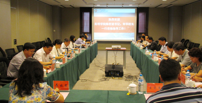 为学习交流昆明理工大学开展党建工作、“三严三实”和“忠诚干净担当”专题教育的情况,考察借鉴昆明理工大学在创新创业教育等方面工作的成功经验,商谈两校有关合作办学事宜, 5月14日下午,党委书记陈世波、校长何华及副校长熊晶、郭华、董建华率党办、组织部、校办、人事处、教务处、科研处等部门主要负责人,到昆明理工大学进行学习考察。昆明理工大学党委书记周荣、校长张英杰、副校长王华、校纪委书记李莉,校长助理、研究生院院长束洪春,以及党办、组织部、人事处、教务处、科技处、校办等部门主要负责人接待了beat365官方网站党政领导一行。