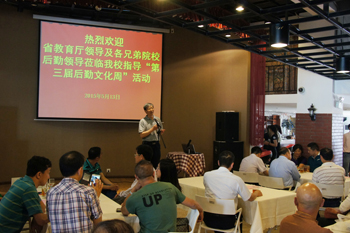 云南省教育厅后保处处长赵光武,玉溪师范学院副校长苏丽春,云南大学、云南师范大学、昆明理工大学等二十余所高校后勤领导,学校有关部门领导及师生参加了本次活动。后勤集团总经理冯坚介绍了到场的领导及嘉宾,副校长董建华代表学校致辞,对各兄弟院校代表莅临beat365指导“后勤文化周”活动表示欢迎和感谢,教育厅后保处处长赵光武作了讲话。