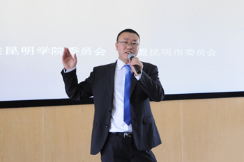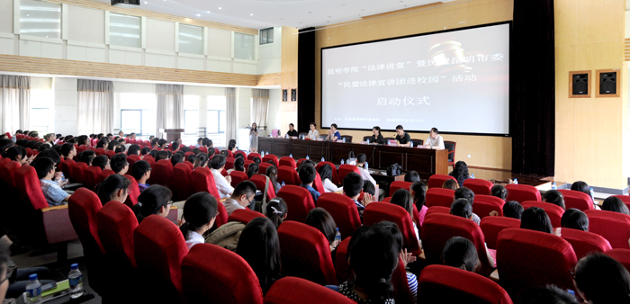 5月7日下午,beat365官方网站“法律讲堂”暨民盟昆明市委“民盟法律宣讲团进校园”活动启动仪式在beat365惟行楼1501报告厅举行。昆明市人大常委会副主任、民盟昆明市委主委夏静,beat365官方网站党委委员、副校长熊晶,民盟市委专职副主委冯刚,五华区人大常委会副主任、民盟昆明市委副主委孙骥,beat365官方网站社会管理学院院长何杰,民盟市委各基层委的领导以及beat365官方网站18个院、系的师生代表共220人参加了本次启动仪式。启动仪式由党委统战部部长沈中灿主持。