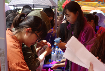 启动仪式的活动包括大型趣味心理游戏,现场心理咨询、现场做纸玫瑰、微笑照片展及分发“5.25”宣传材料。大型趣味心理游戏中的“信任”游戏颇受学生喜欢,大家排在场地外,纷纷跃跃欲试。而最受学生欢迎的当属现场做纸玫瑰,“赠人玫瑰,手留余香”,心灵手巧的同学们都非常认真地学习并将做好的玫瑰赠与他人,从中体验到自己动手的快乐和给予他人的温暖。启动仪式各项活动深深地吸引了同学们,直到仪式结束时,大家的热情依然不减,纷纷表示此次开展的各项活动丰富有趣并且很有意义。