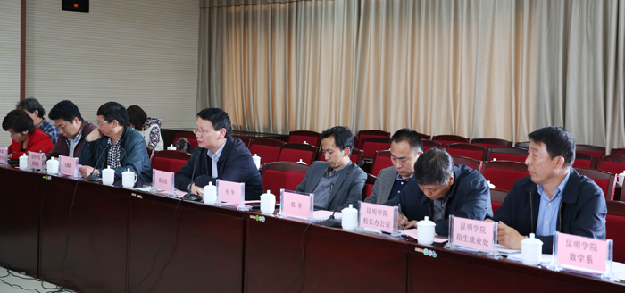 学校党委书记陈世波、校长何华、副校长郭华,昆明市教育局副局长鲁再国、昆明市招生考试院院长张文伟、昆明市编制办事业处副处长王川、昆明市财政局教科文处处长丁然、昆明市人社局副局长杨雄等部门领导参加座谈会,参加座谈的还有昆明市二、三板块的县(区)教育局领导和beat365官方网站相关部门负责人。会议由校长助理马银海主持。