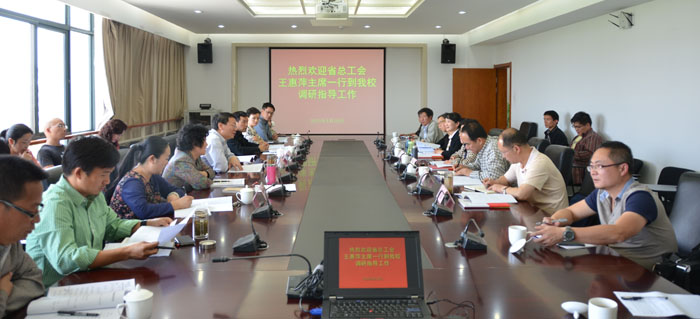 前来调研的省市总工会领导有云南省总工会党组书记、常务副主席王惠萍,昆明市人大常委会副主任、市总工会党组书记、主席戚永宏,云南省总工会办公室主任金勇,云南省总工会政研室调研员拜蓉蓉,昆明市总工会副主席刘辉,昆明市总工会组织部、宣传部、政研室部门负责人。学校党委书记陈世波,党委副书记、校长何华,党委副书记、纪委书记、工会主席李媛芬,校工会常务副主席孙晓坤,校工会副主席刘宇红以及教代会专门委员会、工会委员代表、教师代表等22人在行政楼411会议室参加了调研座谈会。
