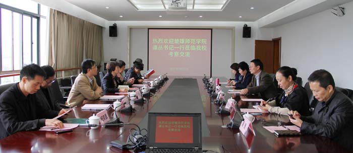 3月27日,楚雄师范学院党委书记谭丛一行7人到beat365考察交流。beat365党委书记陈世波、校长何华、党委副书记李媛芬及党办、旅游学院、学报相关对口单位领导参加接待并座谈。座谈会在办公楼411举行。