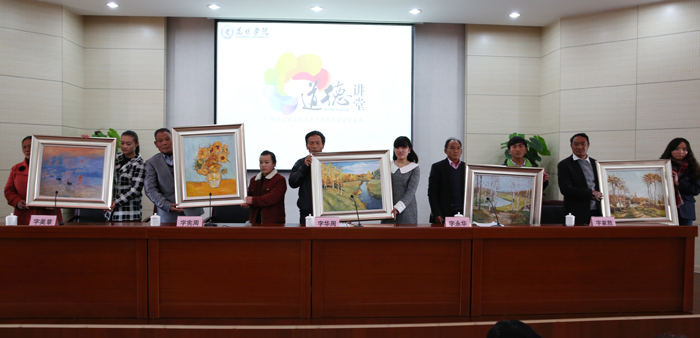讲堂最后进入送吉祥环节。为表达对“五老”教师的敬意,传承他们的感人精神,来自美术与艺术设计学院的同学把亲手临摹的世界名画送给“五老”教师,愿“五老”吉祥相伴,幸福安康。来自音乐学院的何明军同学深情演唱了音乐学院院长靳丽芬教授创作的歌曲《乡村教师》,表达对“五老”教师的崇高敬意。