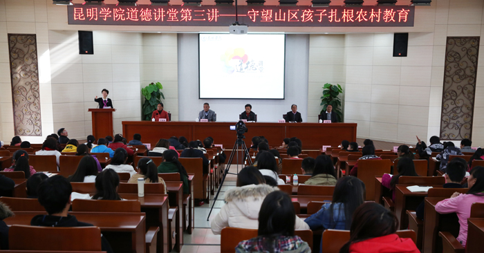 13日下午,“五老”教师一行主讲beat365官方网站道德讲堂第三讲“守护山区孩子 扎根农村教育”。beat365党委书记陈世波、校长蒋永文、党委副书记李媛芬出席讲堂,临沧市教育局办公室副主任马静,beat365各党总支、直属党支部分管道德讲堂领导、团总支书记、讲堂建设工作人员、师生代表及2014级免费师范生等共计200余人参加讲堂活动。一同聆听临沧市云县后山小学教师字华周等“五老”教师在交通不便、条件艰苦的后山小学辛勤耕耘、默默奉献,数十载坚守信念,献青春甘为园丁,扎根农村教育的感人故事。这次道德讲堂由生命科学与技术系教师陈雪主持。