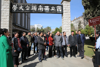 随后,大家步入联大纪念馆,从梅贻琦的“大师说”,到罗庸、张清常“满江红”词牌名的联大校歌,从陈岱孙的“停课赏雨”,到曾昭抡的“空前绝后”,西南联大那一个个充满人文情怀的历史典故和满怀爱国主义精神的历史内涵让领导干部们赞叹不已。尤其,当大家再一次重温联大在艰苦环境中办学,面对日机轰炸、物资匮乏、通货膨胀,师生们仍保持乐观精神,深信抗战必胜,崇尚真理,追求真知,在极度简陋和艰苦的环境中,“同无妨异,异不害同,五色交辉,相得益彰”,精诚团结,弦歌不辍,涌现出了一大批名师巨匠,鼎立治学研究、坚持为国育才,无数从这里走出的学生,成为中国乃至世界的栋梁之才。如此精神和成就让在场领导为之动容和鼓舞。大家在交谈中表示,在办学条件优越的当下,更应向当年的西南联大师生学习,在精神上,学习他们的刚毅坚卓、坚韧不拔、敢于担当;在学习中,学习他们的博古通今、融会贯通;在教育上,重视通才教育,把传统文化的教育融入到当今大学生的学习生活中,将以爱国主义为核心的社会主义核心价值观贯穿到大学生的学习生活中,真正成为国家的栋梁之才。