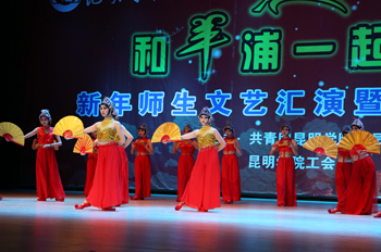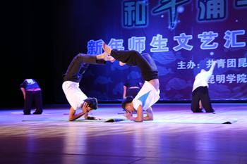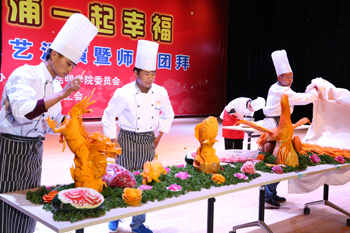 随后,文艺汇演在喜庆、祥和的《喜鹊闹春》中拉开序幕。社会管理学院带来的舞蹈《国粹迎新》,将国粹艺术——京剧和古典舞蹈融合一体,体现了师生对传统文化的传承与创新;教职工展演的热力健身操《活力2015》和健身舞蹈《苗岭炫舞》,展示了教师乐观、健康、向上的精神风貌;美术与艺术设计学院的同学们通过自己的巧手现场为观众表演人体彩绘舞蹈《树》,表达了对大自然的敬畏之心,对美好生活的向往,对生命的尊重与珍惜,倡导保护环境、珍惜家园的社会责任;旅游学院烹饪与营养教育专业的师生带来的专业表演《妙厨呈祥》,展示了学校人才培养和专业技能特色;音乐学院演唱的小合唱《啊哈巴拉》,国际交流合作处瑜伽中心的金牌教师Aukush kumar(安库什 库玛)与体育学院同学们共同表演的瑜伽《柔影禅心》,留学生汤博文表演的钢琴独奏《浏阳河》、《春节序曲》,外国语学院献上的舞蹈《妞啊扭》等节目精彩纷呈、一浪高过一浪,将活动推向高潮。