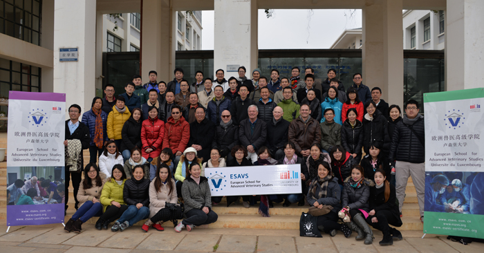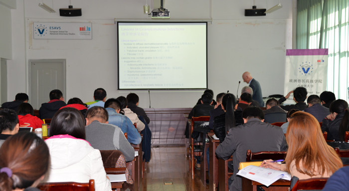 为进一步深化国际合作,拓宽教师视野,丰富教师课程教学内容,增进教学方法和教学模式的思考和改革。经报请校领导研究同意,农学院与欧洲兽医高级学院(ESAVS)合作开展宠物皮肤病学系列课程的培训项目于12月5日上午在农学院1106顺利开班,参训学员来自国内外相关高校和宠物医院共48人,其中来自江苏、安徽、河南、北京、上海、陕西、山东等7个省区29人、泰国13人、马来西亚3人、云南3人,农学院畜牧兽医专业教师共6人参与课程学习。
