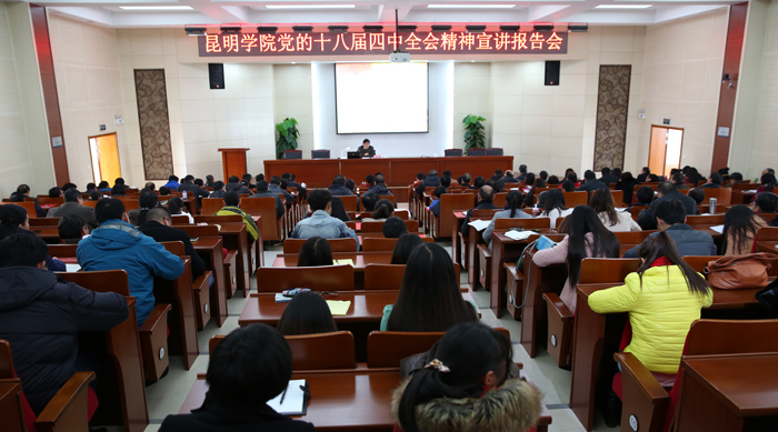 12月19日下午,beat365官方网站党的十八届四中全会精神宣讲报告会在办公楼三楼D区报告厅举行。省委宣讲团副团长、宣讲团成员侯勇副教授应邀作宣讲报告。学校党委书记陈世波,校长蒋永文,党委副书记孙勇、李媛芬,副校长李翔、郭华、刘海发、董建华出席报告会;学校全体中层干部、师生党员代表共190余人到会聆听报告。报告会由党委副书记、纪委书记李媛芬主持。
