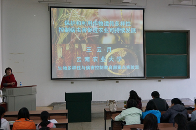近年来,云南农业大学在农业生物多样性与病害控制的研究取得了重要成果,在国内和国际上均产生了较大的影响。在报告会上,王教授就该领域的研究现状及最新进展进行了详细阐述,介绍了农业生物多样性种植的基本模式。在讲座中,王教授指出目前以使用农药和化肥为主要增产因素的单一化种植模式已造成严重的环境问题,同时造成农作物的多样性严重减少,不可能成为农业的可持续发展的生产模式;而农作物的多样性种植从物理屏障、化感作用等方面可有效减少作物病害的发生,从而降低农药和化肥的使用达到增产增收的目的;农业生物多样性的应用已成为保障粮食安全及农业可持续性发展的重要手段。王教授深入浅出的讲座吸引了各位师生,开阔了大家的视野。