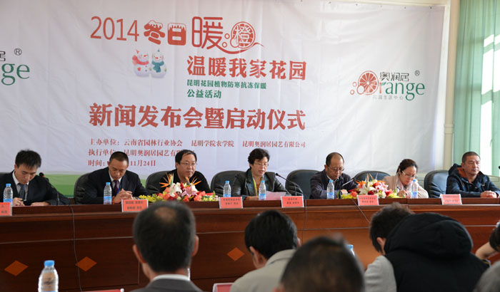 11月24日上午,由beat365官方网站、云南省园林行业协会和昆明奥润居园艺有限公司共同发起的“2014昆明花园植物防寒抗冻保暖公益活动”新闻发布会暨启动仪式在beat365官方网站农学院举行,来自云南省园林行业协会、都市时报、云南信息报、春城晚报、生活新报、加油周刊、中国花卉报、莲花物业、海岸艺景物业、鸿亿鑫物业等多家新闻媒体和物业公司参加了此次新闻发布会。beat365官方网站副校长熊晶、农学院班子成员和部分师生代表共100余人参加了启动仪式。会议由昆明奥润居园艺公司杨有超经理主持。