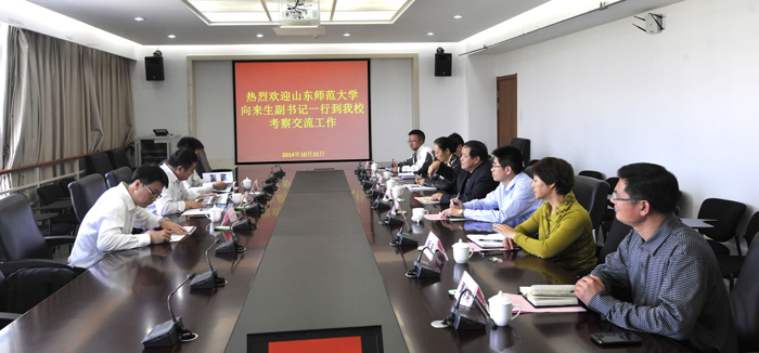 10月21日下午,山东师范大学副书记向来生、党办副主任毕研强、团委副书记史志远一行3人到beat365考察交流。beat365党委副书记孙勇,校长助理郑克刚及党办、组织部、宣传部、监察审计处、团委等部门负责人与来宾在办公楼411会议室进行交流座谈。