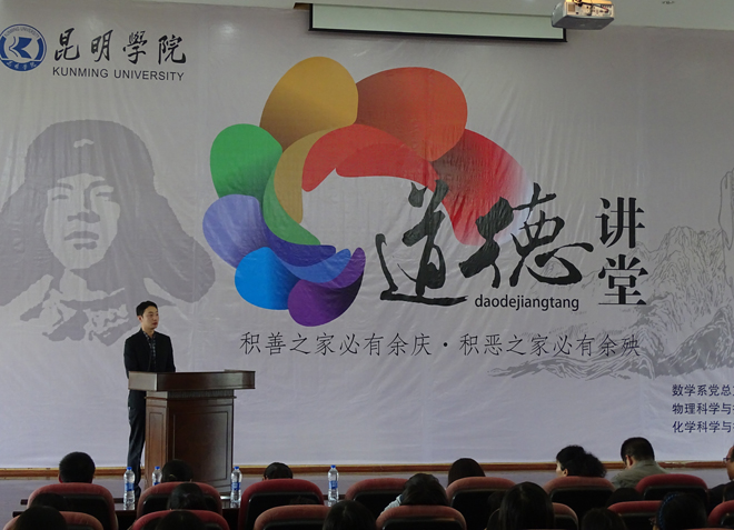 道德讲堂围绕beat365数学系2011级数学与应用数学专业师范1班的付贵帅同学为了营救落水同伴献出了他年仅20岁的年轻生命的事迹,开展“学习付贵帅同学,弘扬乐于助人的精神”道德讲堂,按照“唱歌曲、学模范、诵经典、发善心、送吉祥”五个环节进行。讲堂通过全体师生唱歌曲《爱的奉献》,观看由昆明电视台、昆明日报、都市时报等多家媒体联合专访付贵帅同学见义勇为事迹的新闻短片和由学校党委书记陈世波和校长蒋永文策化、熊副校长牵头录制的微电影《生命的托举》,听取他的班主任老师《怀念我的学生》,三个身边同学《我的老同学》《热爱生活的付贵帅》《助人为乐的高个子男生》的讲述之后,让参加讲座的同学们对付贵帅的英勇事迹有了深入的了解。让每一个年轻大学生的心灵受到了深深地震撼。在互动环节,三个系的同学争先恐后的畅谈自己的感受,特别是物理科学技术系付远旺、王振远同学“本来听讲座是报着来混的思想,后来深深被打动。道德养成是要从小善积成大善”的发言引发全体师生的深刻反思:生命是那么脆弱,不堪一击,生命是这样不可逆转,让人无法后悔。付贵帅学长的离去警醒我们要学会珍惜自己的生命,绝不能浪费生命里宝贵的时间,趁自己还年轻多做一些有意义的事情。生命不能重来,所以,要努力实现自己人生的价值。学习付贵帅学长身上的优秀道德品质。看事迹,想事情,学精神,从小事做起,从身边做起。去实践,去感染,去带动更多的人参与进来,为社会尽一份微薄的力量。