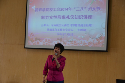 3月6日下午,校工会,校女工委员会特邀东方航空云南公司客舱部副总经理,博润礼仪工作室负责人安博润女士在惟行楼1501报告厅作庆“三八”妇女节女性魅力形象知识讲座。副校长熊晶,部分中层女干部及各分工会200余名女性教职员工、学校礼仪队的骨干参加了讲座。