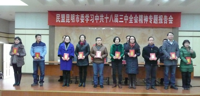 12月20日,民盟昆明市委在五华区政府四楼多功能厅召开中共十八届三中全会精神专题报告会,民盟beat365官方网站总支10名盟员代表聆听了中共昆明市委宣讲团成员、市委政策研究室龚志龙主任对十八届三中全会精神的解读。