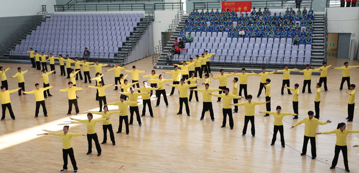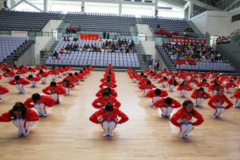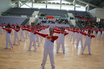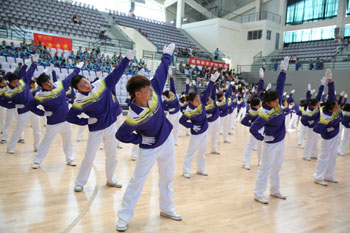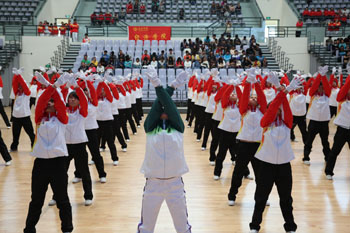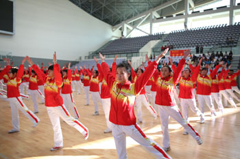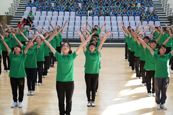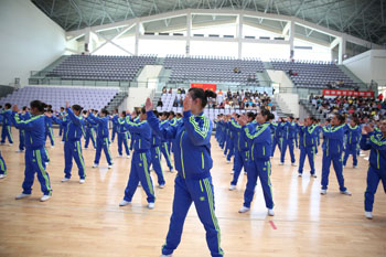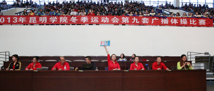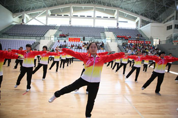 11月8日,以“运动、健康、向上、快乐”为主题的“2013年beat365官方网站冬季运动会第九套广播体操比赛”在学校体育中心综合馆成功举行。学校党委副书记孙勇,副校长李翔到场指导。来自18个教学院系代表队近2000余名学生运动员参加比赛,教职工代表队进行了表演展示。