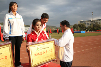 颁奖仪式后,熊副校长致闭幕词。她首先向在本次运动会上取得优异成绩的集体和个人表示热烈的祝贺,向三天来辛勤工作、任劳任怨的全体裁判员、工作人员表示衷心的感谢和亲切的慰问。熊副校长指出,通过本届运动会,一批身体条件较好、运动素质较高、竞技能力较强的同学脱颖而出,他们不仅是代表队的骄傲,也是学校的骄傲。在教职工竞技项目中,广大教职工积极参与,特别是环校园长跑比赛中,陈书记、蒋校长等校领导带头参加,充分展现了beat365全民健身活动热潮和教职工团结协作、昂扬向上的精神与活力。