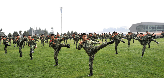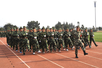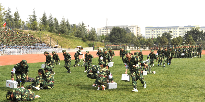 学生军训总结大会上,陈世波书记检阅了2013级学生军训团受阅方队后,分列式和队列操、擒敌拳、战伤救护、消防等科目的汇报表演逐一进行,边防士官学校100名学员组成的方队也进行了擒敌术、威风锣鼓的现场展示,同学们精彩的表演和教官们整齐化一的动作展示赢得了学校领导、部队首长以及现场观众的阵阵掌声和好评。