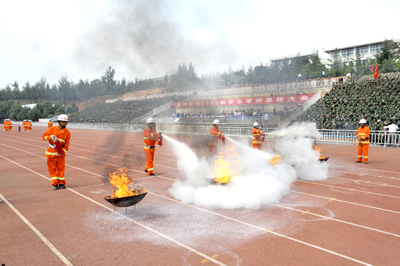 接着队员们表演了灭火器火盆灭火操。火情就是命令,火盆里窜出雄雄火焰,队员们提着灭火器快速冲向火盆,拔出保险销,对准火源根部,压下把手,一团团干粉向火舌喷去,刹时,熊熊烈火被队员们准确快速地扑灭了。