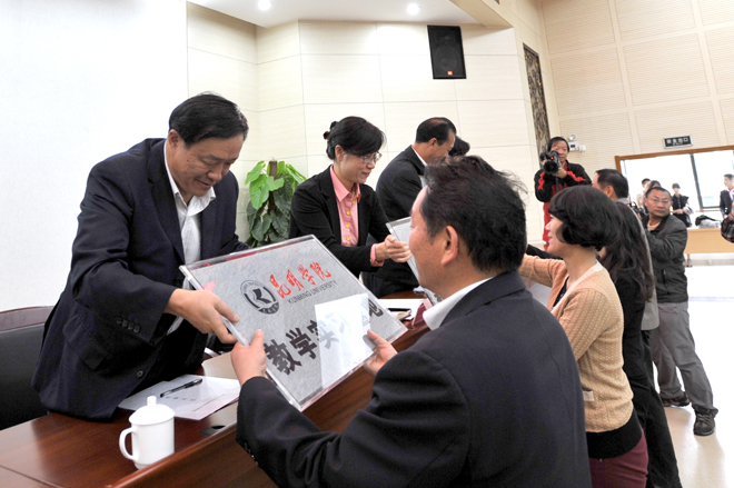 随后举行了授牌仪式。由参会领导向昆明市盲哑学校、盘龙区培智学校、五华区新萌学校授予beat365官方网站特殊教育专业教学实习基地的牌子,今后这四所学校将成为beat365官方网站特殊教育专业的首批实习见习基地。