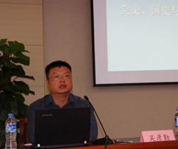 7月18日下午,在办公楼D区3楼报告厅,学校举办干部教育培训专题讲座。全体学校领导、中层干部(包括改任非领导职务的中层干部)和机关党总支各支部书记参加听报告。人文学院副院长、副教授吴彦勤博士主讲。党委副书记孙勇主持报告会。