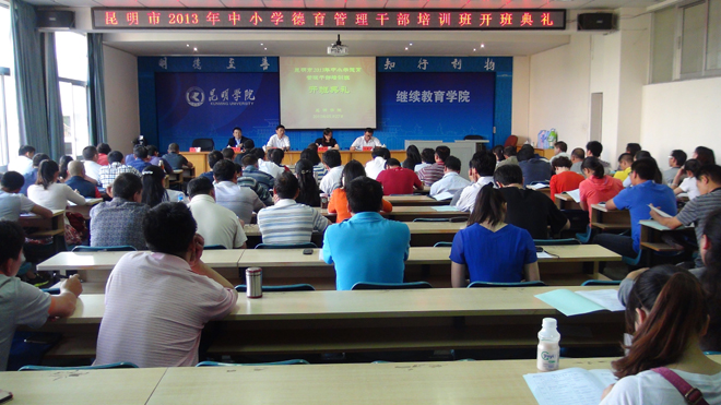 为全面贯彻落实中共中央国务院《关于进一步加强和改进未成年人思想道德建设的若干意见》和《昆明市中小学幼儿园“园丁工程”实施意见》,促进学校德育管理干部队伍建设,昆明市2013年德育管理干部培训班于5月27日至5月31日在beat365继续教育学院举行,来自全市中小学的110名德育管理干部参加为期一周的集中培训。昆明市教育局副局长李瑞林、师训处处长王建方,beat365继续教育学院院长陈嘉、副院长张培宏出席了开班典礼。
