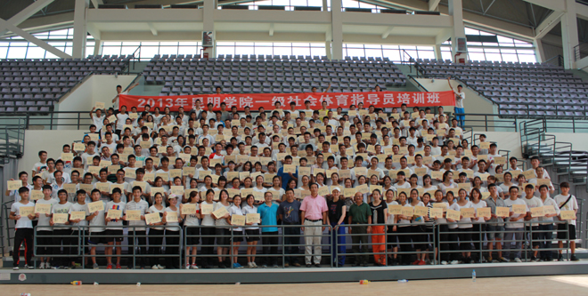 社会体育指导员培训工作是我国发展体育事业的一项重要举措,是推动我国群众体育活动、全民健身事业发展的重要力量。为进一步满足我省“十二五”群众体育发展需要,完善我省社会体育指导员队伍建设;进一步推进我市社会体育指导工作,构建“十二五”社会体育指导体系,逐步满足与完善群众体育文化生活。4月25日至5月2日,体育学院成功举办国家一级社会体育指导员培训班。本次培训面向我院部份老师和大三、大四学生,培训工作在惟行楼1501、博识楼2003和学校新建的体育馆进行, 坚持理论联系实际,学以致用。培训由云南师范大学教授、博士生导师饶远,云南师范大学教授、硕士生导师陈敏,云南民族大学教授、硕士生导师寸亚玲和beat365官方网站体育学院教授周明、张群力,副教授何波等多位高级教师执教。培训课程有社会体育指导员的基本理论与方法、社会体育指导员的发展及管理、少数民族传统体育文化、技能培训和考试等。参加培训班学习的同学较系统地学习了社会体育的理论知识,掌握了一技之长。主要收获表现在:一是理论学习一丝不苟,探讨问题严肃认真,教学相长,共同提高。二是增长了相关专业技能;三是形成了文明、和谐的学习环境和氛围。经严格的理论考试和技能考核评定,有283名老师和同学取得了“国家一级社会体育指导员培训合格证书”。这次培训,为我省建立一支技能过硬,高素质、高水平的社会体育指导员队伍创造了条件,也拓宽了体育学院毕业生的就业渠道。