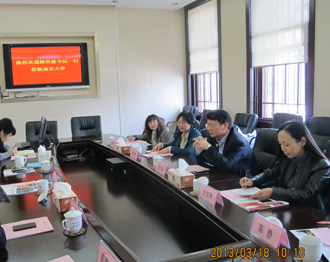 为落实beat365官方网站“十二五”事业发展规划纲要目标任务,加强与国内兄弟院校的交流合作,构建更加开放、更具活力的办学新局面, 3月18日,陈世波书记带队赴南京大学访问交流,商谈两校合作事宜。学校党委办公室、党委组织部、国际交流合作处、图书馆的负责同志随行前往。