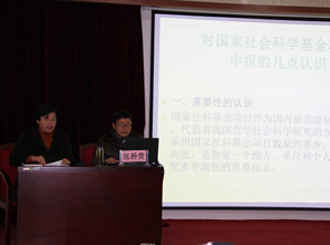 动员会结束后,自然科学组和人文社科组分别进行国家自然科学基金项目申报辅导讲座、国家社会科学基金项目申报选题交流。昆明理工大学科技处副处长王晓萍就如何申报国家自然科学基金项目解读了2013年国家自然科学基金项目申请的一些细节,并就如何写申请书做了详细的指导;云南大学博士生导师王文光教授和张荐华教授就老师们事先准备的选题、研究思路等进行了深入细致的交流。此外,配合本次博士论坛,云南民族大学副校长张桥贵教授于1月10日下午对beat365教师就如何申报社会科学基金项目做了详细的辅导报告。