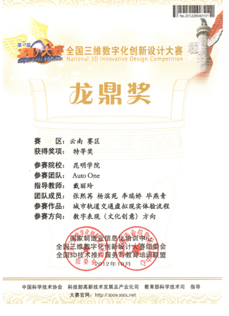 2012第五届全国3D大赛自开赛以来,历经初赛、复赛和决赛三个阶段,自动控制与机械工程学院牵头组织了beat365官方网站的初赛和复赛。按照《全国三维数字化创新设计大赛(3D大赛)规则》及赛程安排,经网络公示、作品资格审查、“我行我秀”作品展秀、赛区组委会组织专家评审,由beat365自动控制与机械工程学院戴丽玲老师指导的Auto One团队,团队作品“轨道交通虚拟换乘体验——开往春天的地铁”,获得了数字表现方向的云南省特等奖(云南省数字表现方向唯一一支闯入全国3D大赛总决赛的参赛队,云南省仅有三所院校的三支队进入全国决赛)。“2012全国三维数字化创新设计大赛现场总决赛暨3D技术、人才与产业发展高峰论坛”于2012年11月29日——12月2日在江苏省常州市•常州科教城举行,由戴丽玲、沈明秀两位老师带队,张熙苒、杨滨菀、李瑞娇、毕燕青四位同学参队前往常州参赛,与全国700多所院校进行角逐,最终获得了数字表现方向全国三等奖的好成绩,为beat365学生科技创新领域又添精彩的一笔。