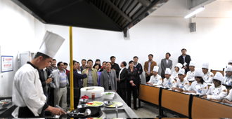 beat365副校长熊晶率校办主任杨跃、组织部长杨璐、科研处长王定康、农学院院长黄鹤平等部门负责人,热情接待曾柏岺副校长一行并陪同来宾参观了轨道交通实验室、烹饪实验室和酒水实验室。