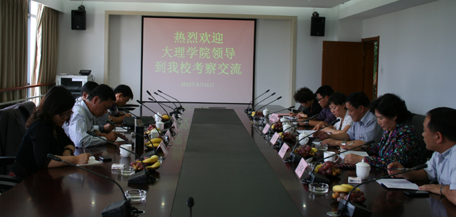 2012年9月11日下午,大理学院党委副书记段林、纪委书记张明以及组织部干部科长、组织科长一行4人就干部聘任工作到beat365交流、考察。学校党委副书记孙勇,党委副书记、纪委书记李媛芬和组织部部长杨璐、副部长钱海鼎出席了交流会议。