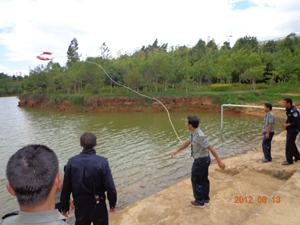 在安全培训中,校卫队管理科高克玉科长介绍了听心湖水域的基本情况和环湖周边救生设备的分布位置及使用方法,并对保安员和学生治安服务队队员在日常巡逻和突遇紧急情况时在施救过程中提出了具体要求。最后在听心湖畔现场组织进行了紧急施救时救生圈的抛掷训练。