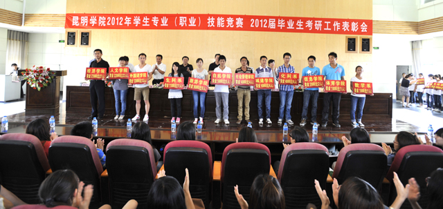 5月23日下午,学校在惟行楼1501阶梯会议室隆重召开2012学年学生专业(职业)技能竞赛暨2012届毕业生考研工作表彰大会。学校校长陈世波等全体校领导,组织部、宣传部、人事处、校团委、计财处、学生处、科研处、招生就业处、图书馆、后勤集团及教务处等部门的主要负责人,各教学单位行政主要负责人及分管教学负责人,考研负责教师及专业(职业)技能竞赛获奖指导教师,专业(职业)技能竞赛中获奖的及考研上线的全体同学,各院系学生代表共二百余人参加会议。会议罗明东副校长主持。