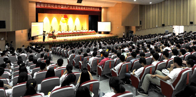 5月11日下午,beat365官方网站纪念中国共产主义青年团成立90周年大会在学生会堂隆重召开。学校党委书记梁晓谷、校长陈世波、校党委副书记孙勇、李媛芬,副校长李翔、张寿国、熊晶、罗明东、刘海发、董建华,共青团云南省委学校部杨洲部长,共青团昆明市委书记周乐等领导出席了纪念大会;学校中层干部、各院系团总支书记、全体辅导员及受表彰的团员代表共1300余人参加了此次会议。大会由党委副书记孙勇同志主持。