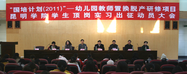 会上,职业技术教育中心主任熊绍宏老师着重介绍了“国培计划”实施的背景、任务、意义以及云南省近两年来实施国培计划的情况。教师教育学院主持工作的副院长唐敏教授则从专业知识和技能方面要求全体同学们做好各种准备。罗明东副校长在会上作了重要讲话,他要求每一位同学要牢记“国培计划”的使命,充分认识此项工作的重大意义,明确职责和任务,从思想、心理、专业知识和技能等方面做好充分准备。他希望同学们要利用参与此次“国培计划”的机会,深入基层、了解社会、拓宽视野、增长知识和才干。同学们要克服种种困难,在为当地学前教育事业科学发展做出贡献的基础上,展示beat365大学生的风采,自觉维护学校的良好形象和声誉。2009级学前教育2班包敏同学代表全体同学发言,表达了完成此次顶岗置换实习任务的态度和决心。最后,刘海发副校长作了总结讲话,他要求职业技术教育中心、教师教育学院要协调好各方面的关系,学校也会创造一切条件为同学们解决后顾之忧,希望同学们安心并用心对待此项工作,不负国家的重托和学校的期望,圆满完成此次顶岗置换实习任务。刘副校长还就顶岗实习期间的安全问题作了具体要求,希望同学们要增强个人安全防范意识,杜绝任何安全事故的发生,职教中心和教师教育学院要主动全面跟踪每个实习点学生的情况,要为学生开设24小时开机的热线电话,为学生提供全天候服务。