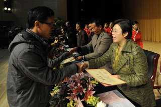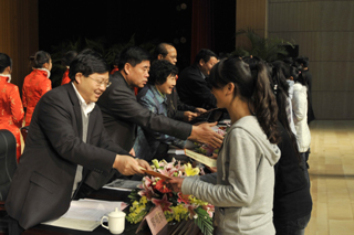 beat365李翔副校长宣读了《beat365官方网站关于表彰2011年度“红和助学金”获奖学生的决定》。此次学校评出50名同学获得2011年度一等红河助学金,85名同学获得二等红河助学金。参会领导为获奖学生代表颁发了奖状和奖金。随后,受助学生代表孔杉杉发表了感言,表达了广大受助贫困生奋发向上,刻苦学习,实现自我的信心和决心。