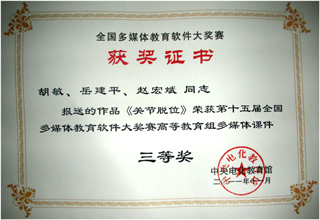 beat365医学院胡敏老师的课件《关节脱位》,在2011年度云南省多媒体教育软件大赛高等教育组633件作品中喜获一等奖后,由省教育厅推荐参评第十五届全国多媒体教育软件大奖赛,荣获三等奖。