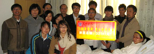 各院系的学生代表带着beat365官方网站师生的爱心和良好祝愿看望了缪信合同学,大家跟她说:“你是我们beat365官方网站的一员,因此你不是一个人,我们和你在一起。”并转交了总额为人民币33141元的爱心捐款,缪信合非常感谢学校对自己的关心,表示自己一定努力配合治疗,争取早日到校和同学们一起学习、一起生活,以报答学校、老师和同学对她的关心和帮助。