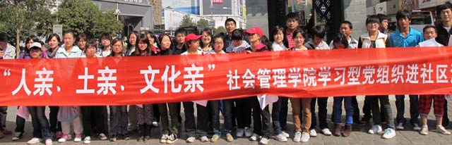 为了学习实践党的十七届六中全会建设“文化强国”、“保障人民基本文化权益”的会议精神,推进学习型党组织建设从形式学习向实践的转变,社会管理学院党总支组织学生党员沿着盘龙江向昆明市市民作“人亲,土亲,文化亲”宣传与调研活动。