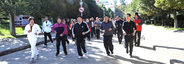 10时许,在聂耳广场还举行了“beat365官方网站教工文化协会(俱乐部)成立暨2011年教工运动会”教职工环校园跑项目起跑仪式。党委副书记李媛芬发令,在党委副书记孙勇、副校长李翔等校领导的领跑下,全校1500余名教职工开始了环校园跑。充分展示了全体教职员工热爱生活、热爱学校、热爱教育、热爱学生,追求健康,团结一心,把校园当家园建设,把学生当自己的孩子来培养。